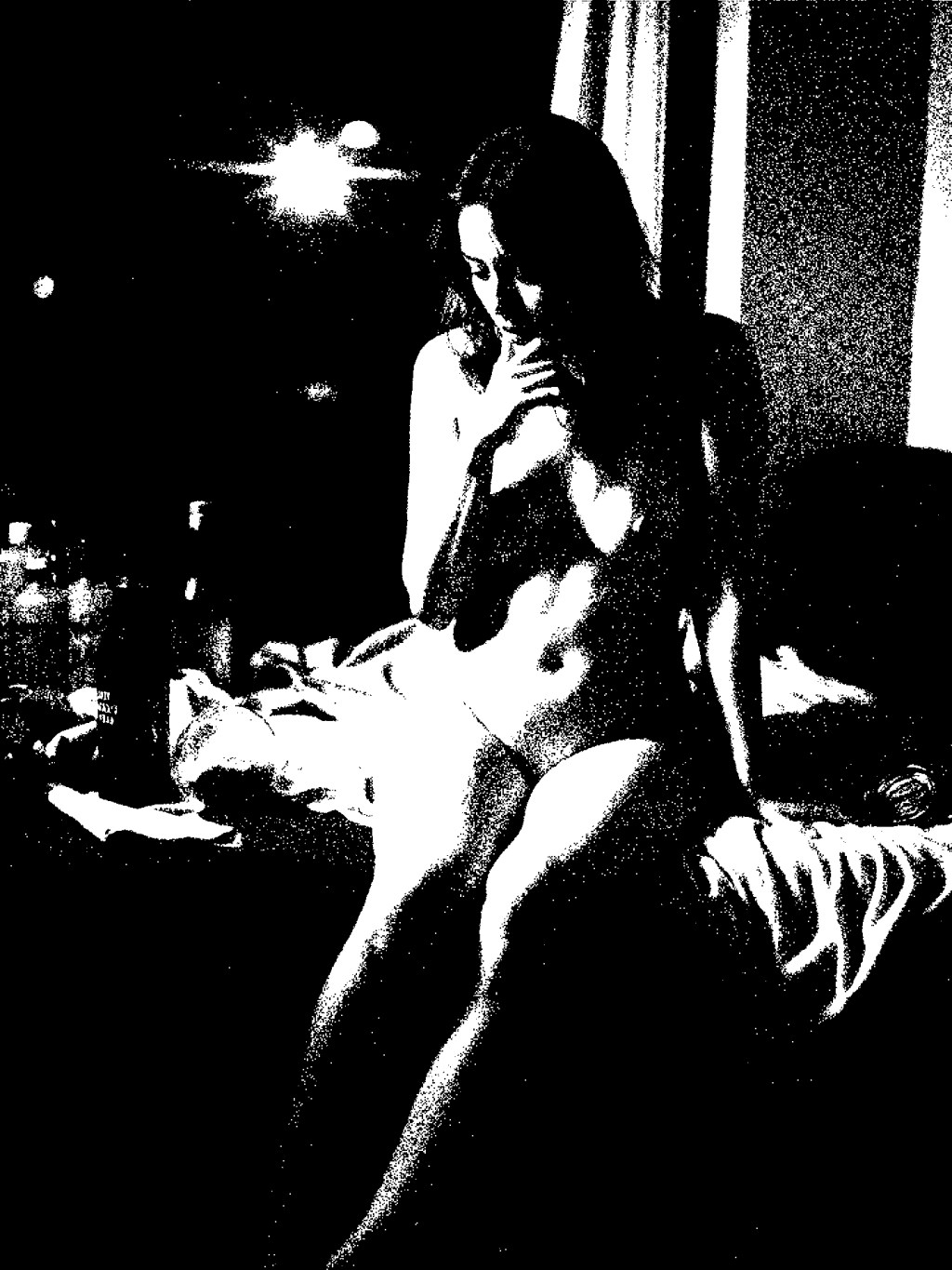 The night lingers in her room like smoke, thick with unsaid things. A city glows beyond the glass, distant and indifferent. She doesn’t look out—it’s the space inside that feels louder. Fingers trace her lips, not in vanity but in thought, caught between memory and impulse. Whatever happened just before, it’s still here, heavy in the hush.