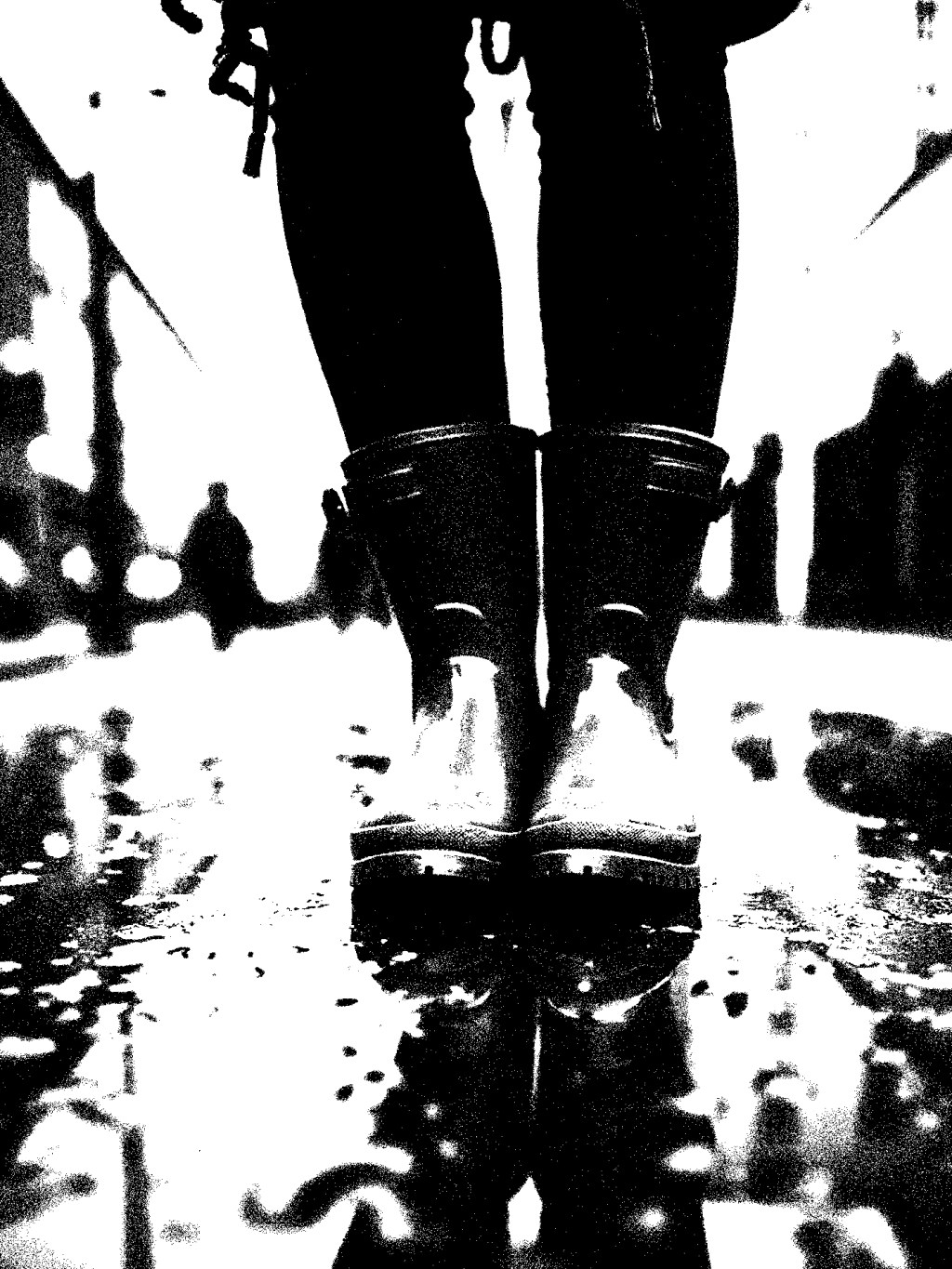 Rain didn’t chase her—it framed her. Boots planted, reflection doubled, she stood at the edge of motion while the city blurred past behind her. She wasn’t waiting. She was claiming her moment.