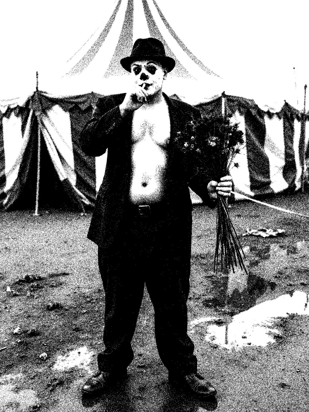 A flower for no one, a smoke for the void. He stands where the tent sags and the crowd’s long gone—half showman, half shadow, fully forgotten. The circus isn’t over. It just stopped pretending.