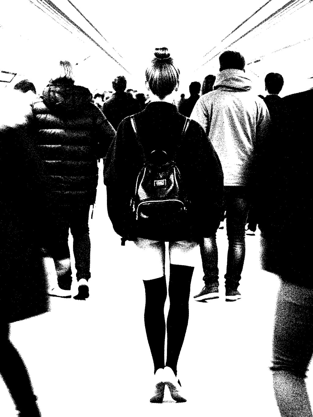 In a river of motion, she stands like punctuation—neither rushing nor resisting, just witnessing the flow in her own silent syntax.