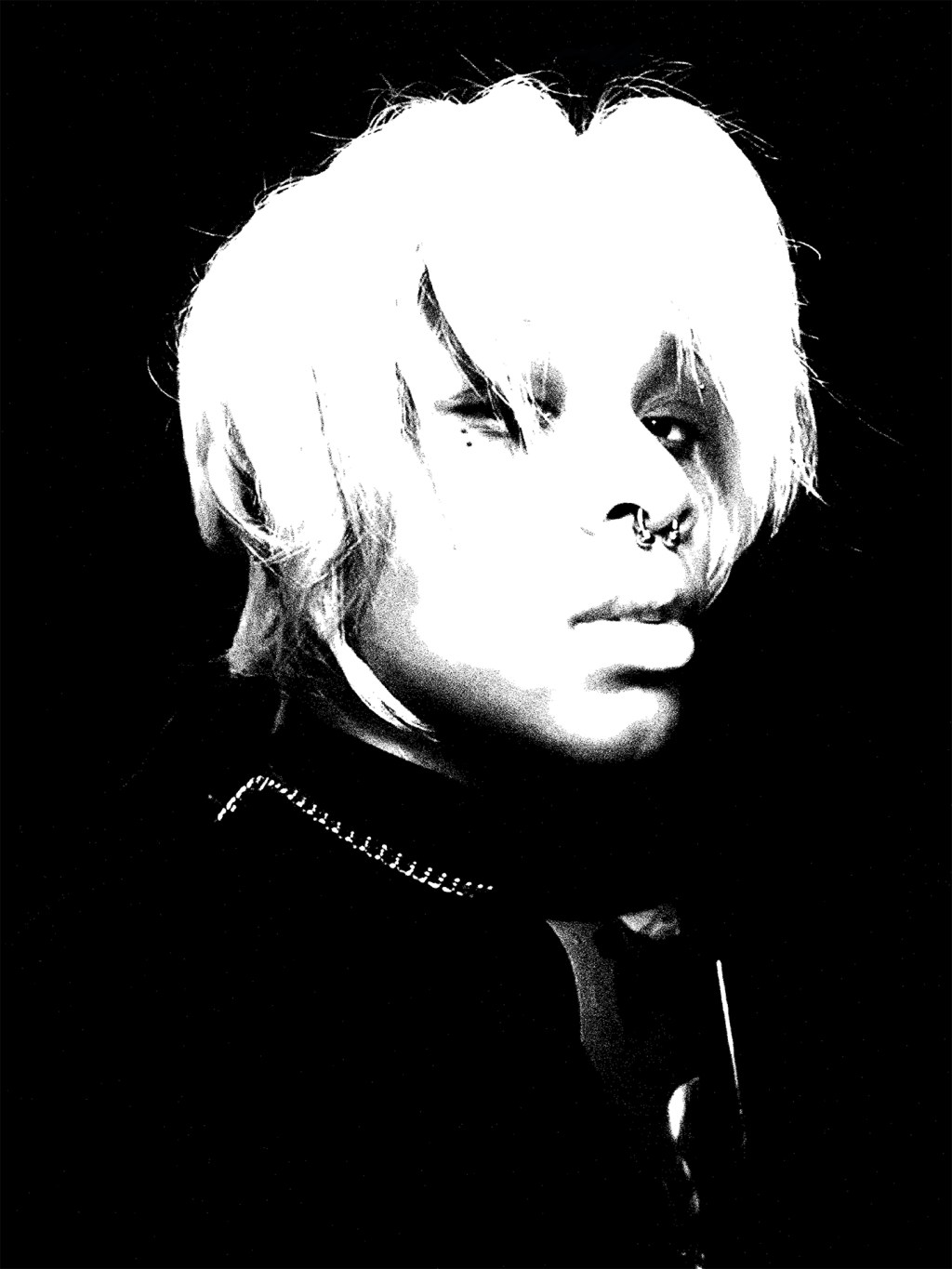 A quiet storm held in one frame—Fin doesn’t speak here, but everything about them shouts defiance and control. The hair, nearly glowing, draws the eye while shadows cling like a second skin.