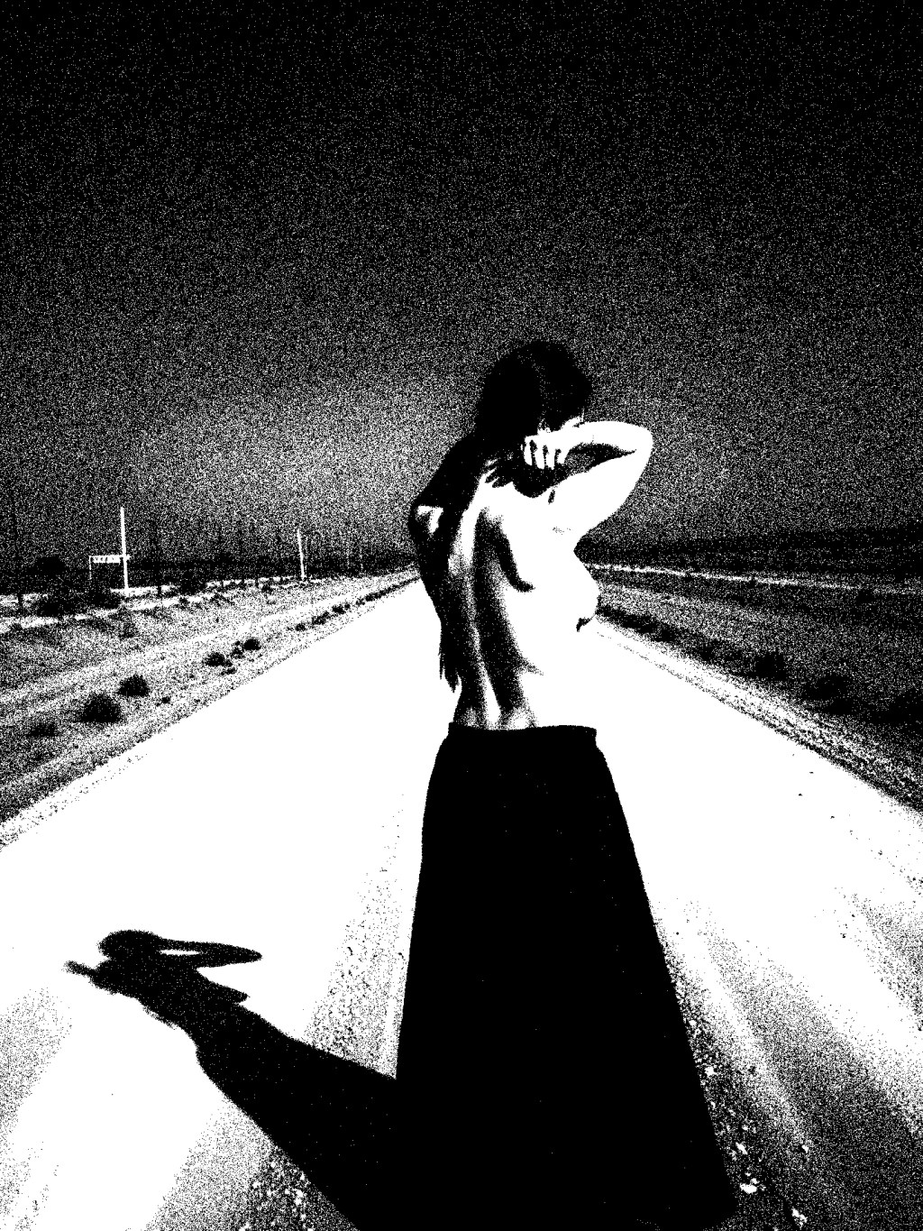 Created during a heatwave road trip into nowhere, this scene captures the ache of stillness and solitude. Her silhouette, paused mid-step, holds the tension of turning back—or continuing forever into the void.