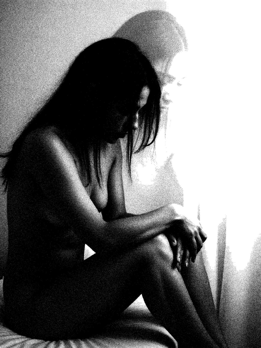 She folds into silence, framed by morning. A second self flickers beside her—part memory, part ghost.