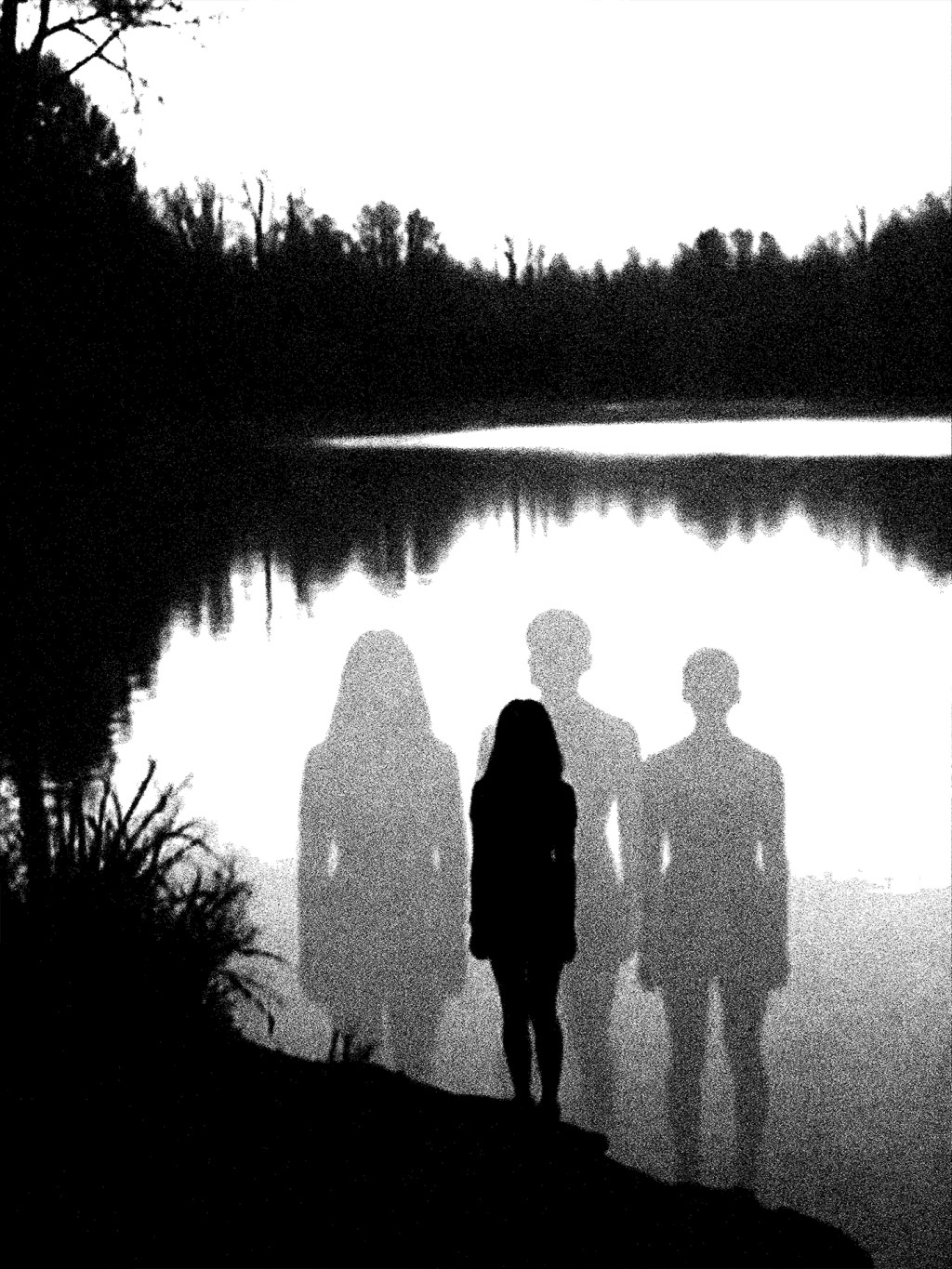 At the water’s edge, memory gathers like mist. The outlines aren’t ghosts—they’re moments that never quite left, standing in silence behind her.
