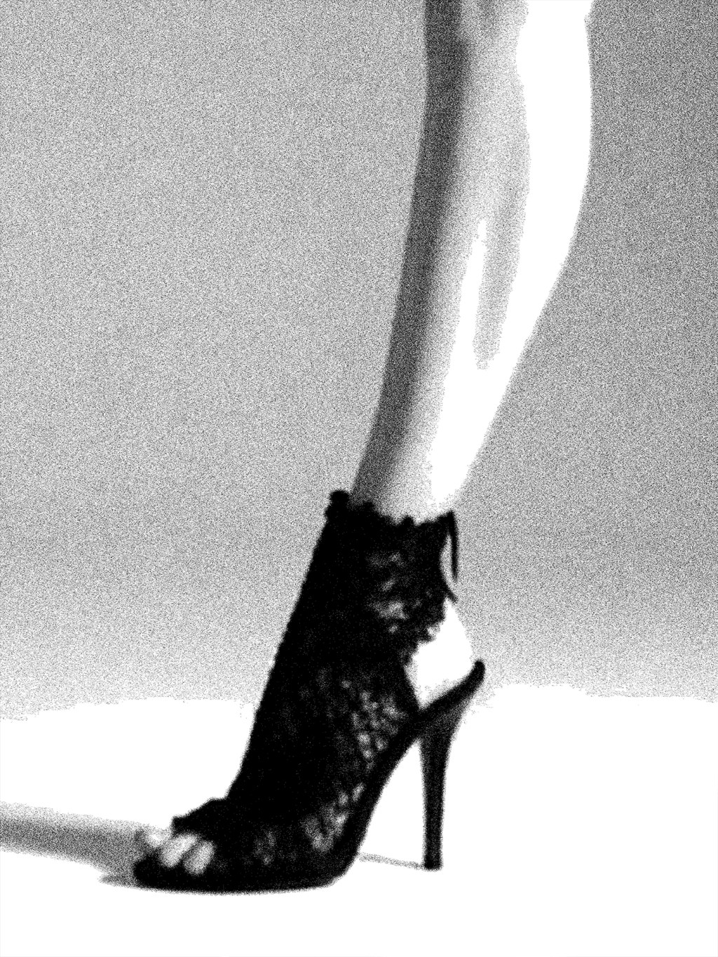 Captured mid-step, the elegance is all tension—grace suspended in a stiletto. She moves like punctuation in silence.