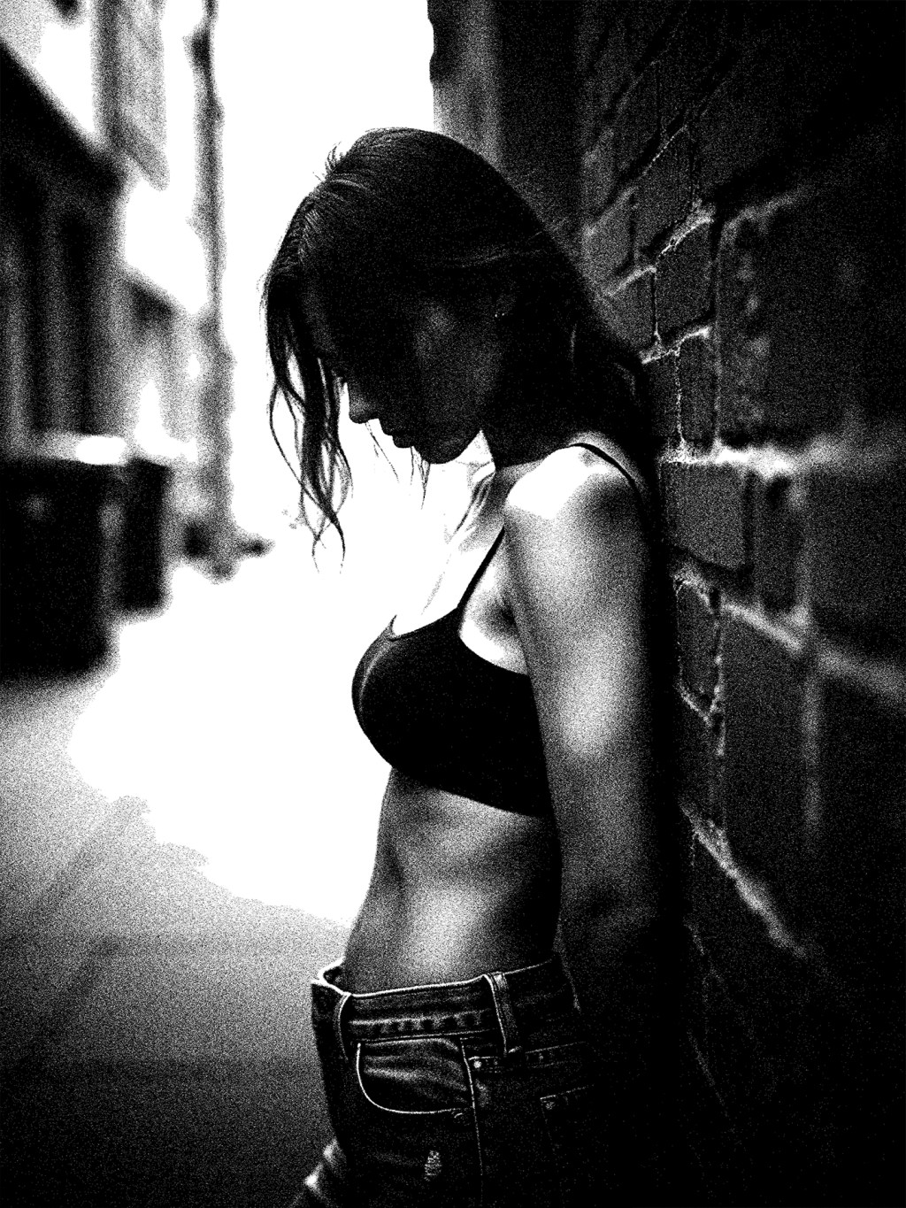 She leans into shadow, head bowed, as if listening for something lost. The brick wall anchors her, but the light behind suggests escape.