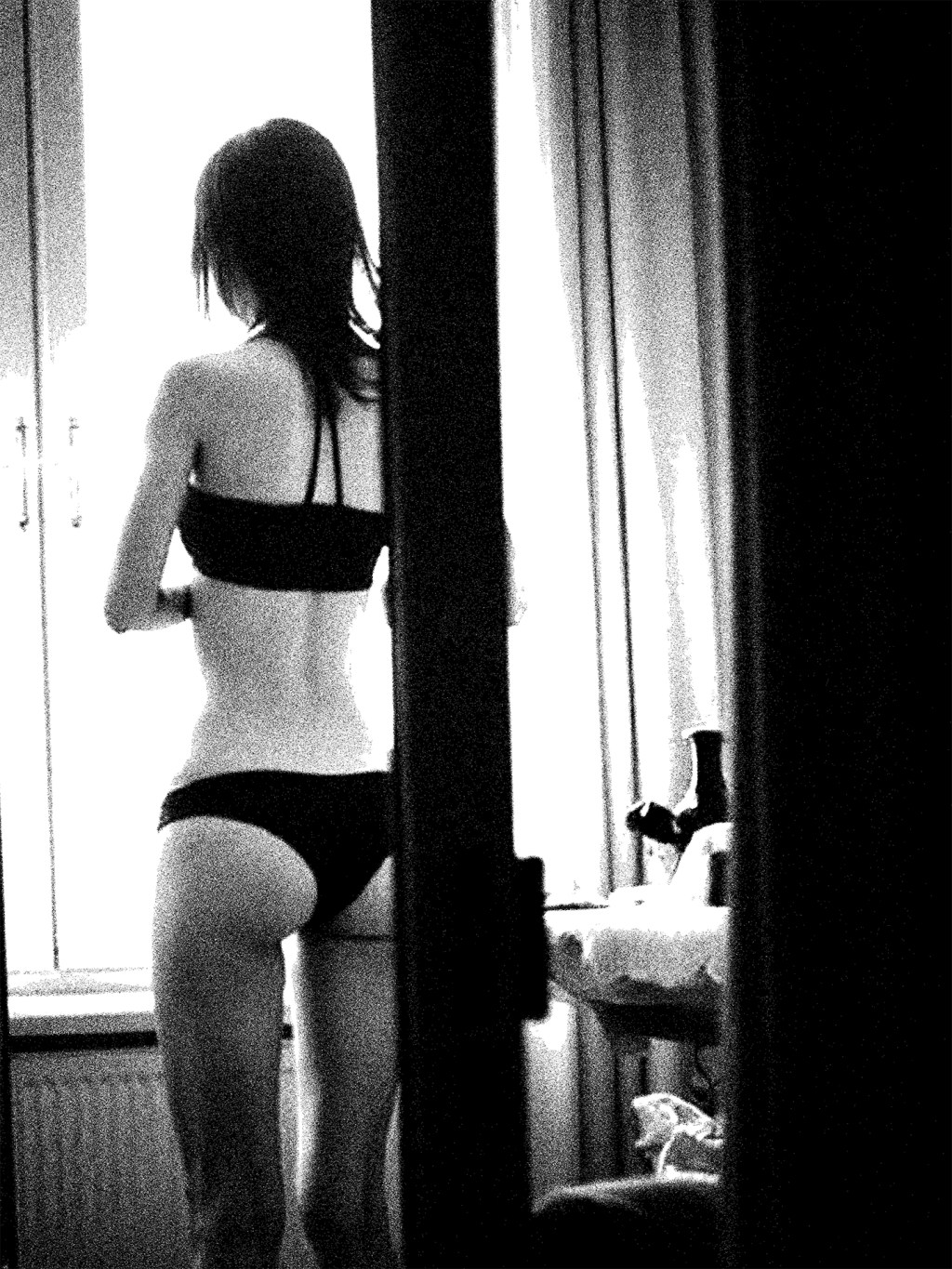 She faces the window, spine drawn in stillness. The room watches quietly as she meets the day without a word. The moment feels stolen—soft, distant, entirely her own.