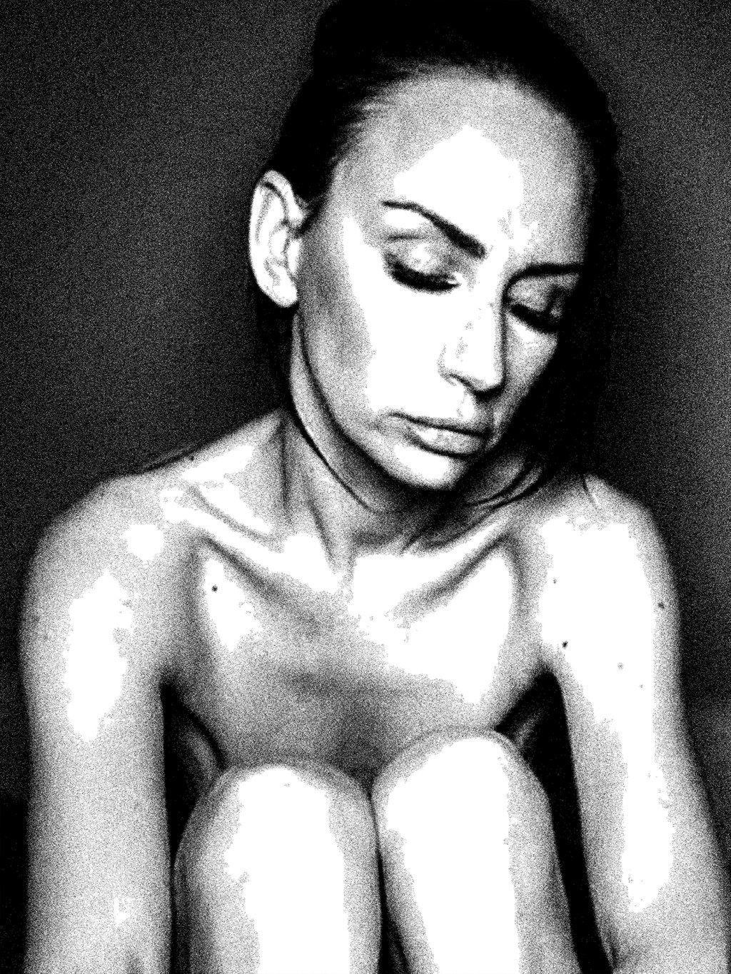 Folded into herself, she listens for something only silence can offer. Light drapes her like memory—tender, unresolved. There’s strength in the stillness, softness in the shadows.