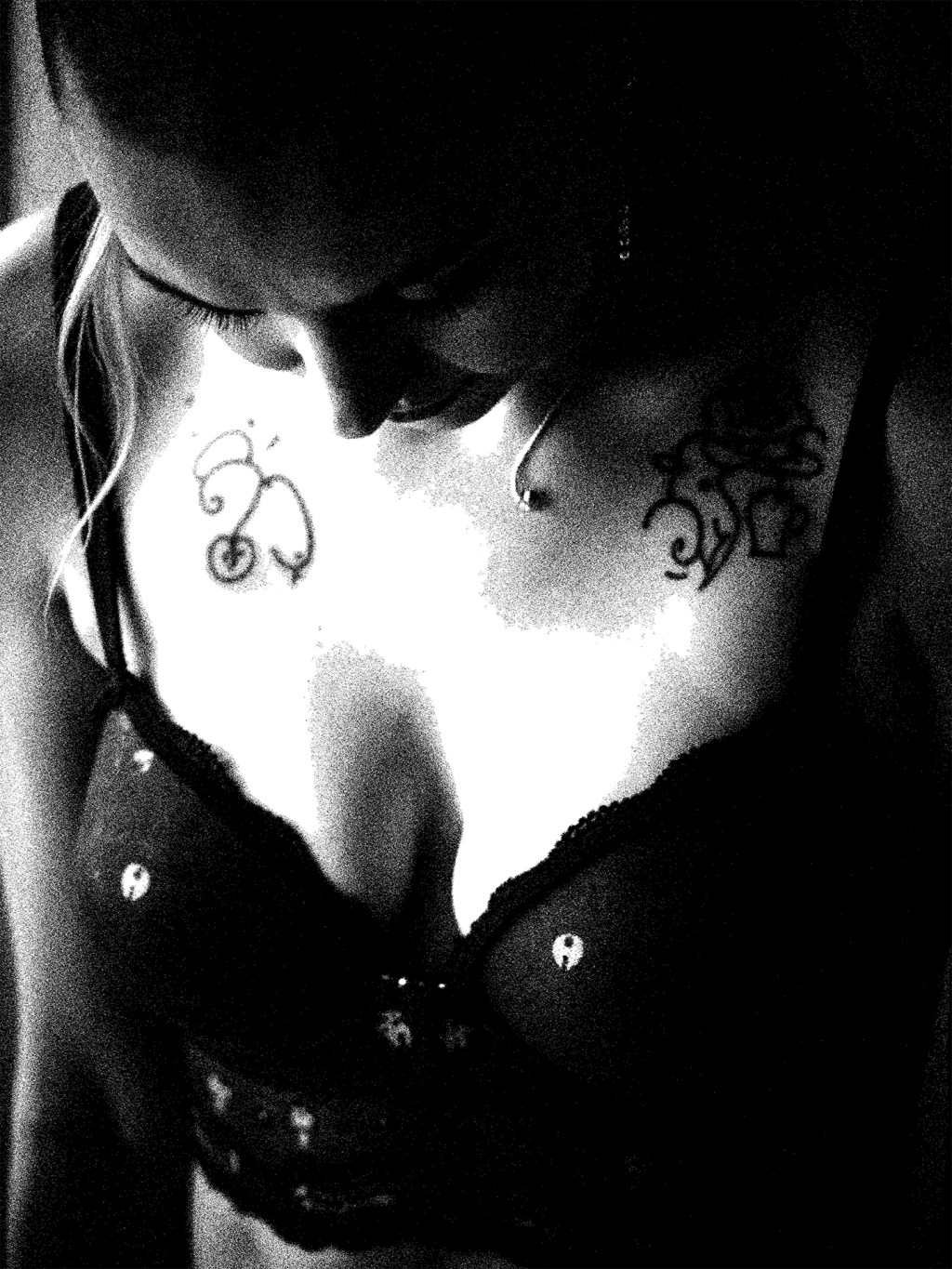 Eyes lowered, she folds into a tender silence. Ink and shadow script a language only the heart can read.