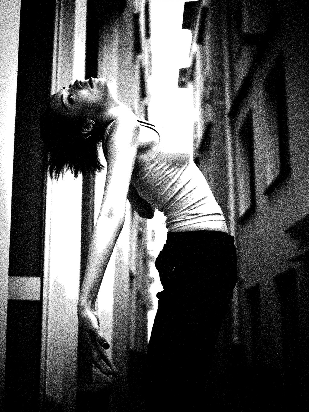 Bent back against unseen weight, she floats where alleys forget the sun. In this narrow breath of space, defiance turns to surrender.