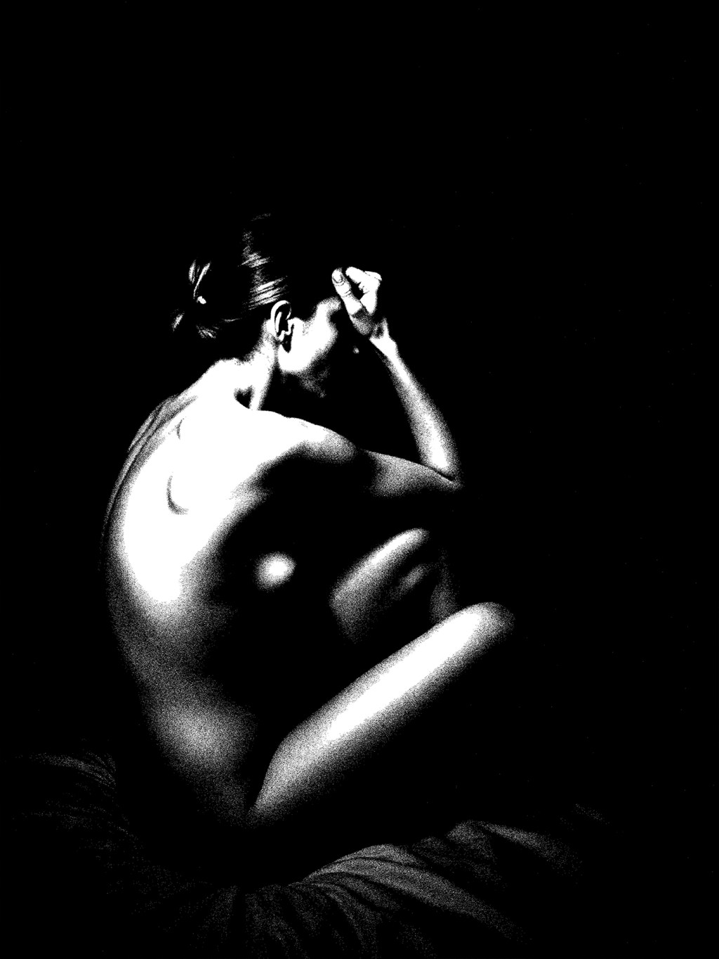 Curled within the dark, she becomes a constellation of tension and grace. Light trails her form like a memory not yet faded, a tender balance between strength and surrender, thought and forgetting.