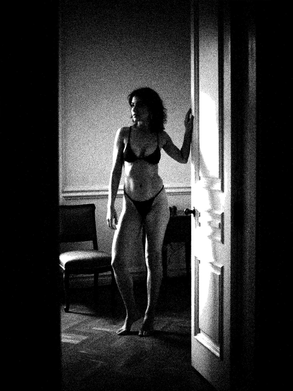 She stands in the doorway, half in shadow, half in light—a moment suspended between invitation and command. Every curve, every line, tells a story without words.