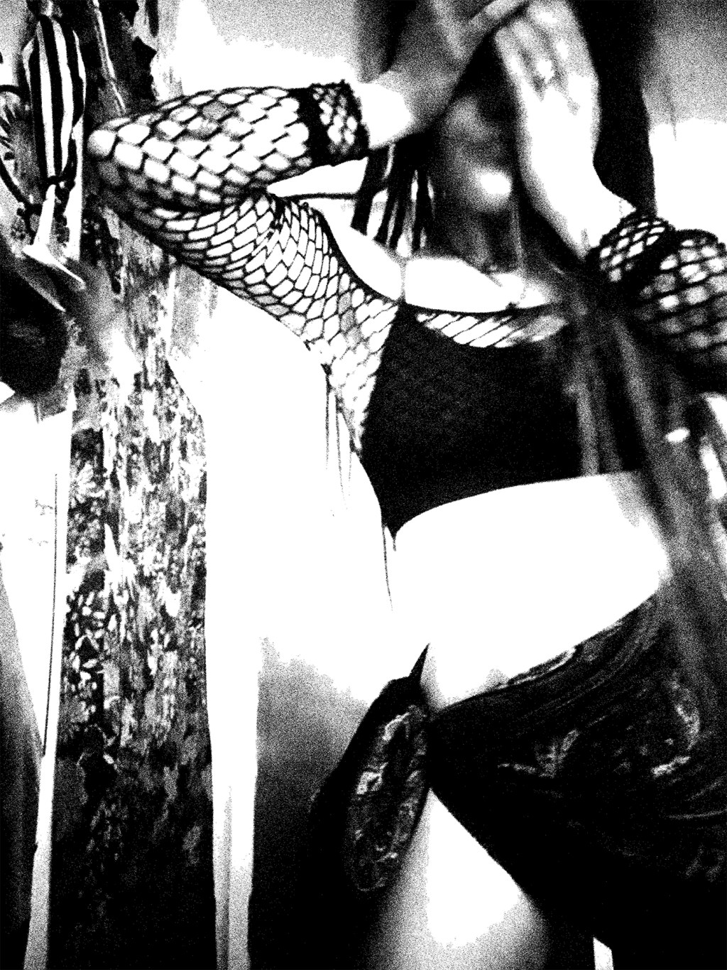 Veiled by motion, she dances between shadows and armor—fishnet, velvet, and defiance. Her body tells a story her face refuses to show.