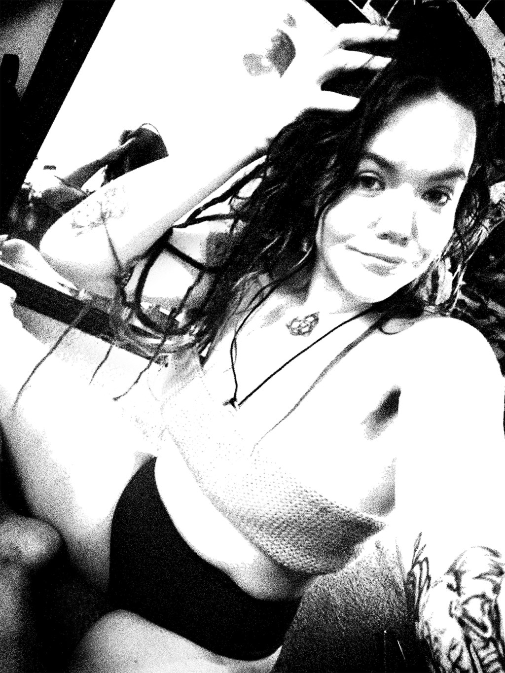She meets the lens with unrushed charm, fingers in her hair like waves in mid-motion. Ink decorates her skin, but it’s her smile that tattoos itself in memory.