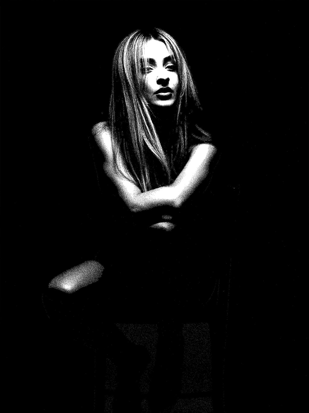 Every strand of her hair falls with intent, framing a gaze that dares the dark to move. There’s elegance in the hush, and power in her calm.
