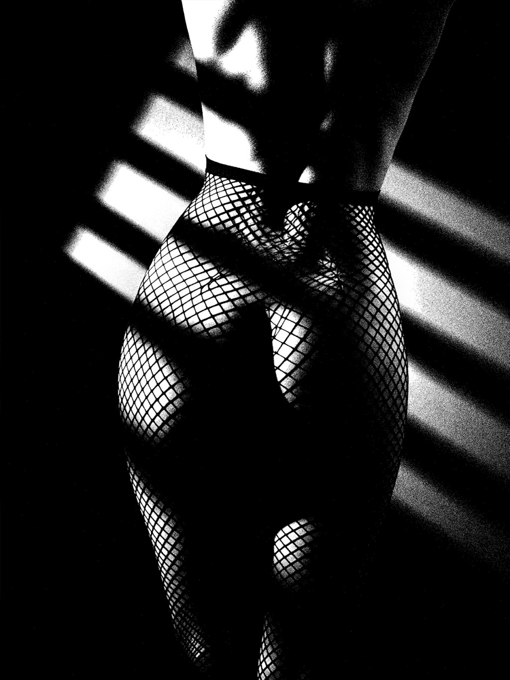 Her back curves like a verse of poetry, strong and unapologetically hers. Light slices through shadow, sculpting power in mesh and motion.