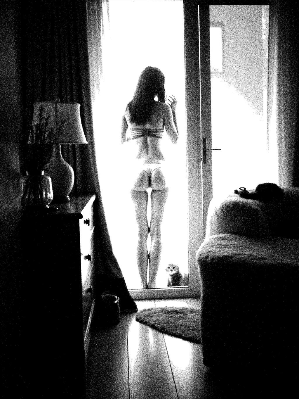 She stands in the hush of daylight, curves traced in quiet defiance. A moment held between breath and boldness, tender and unapologetic. Even the cat pauses in reverence.