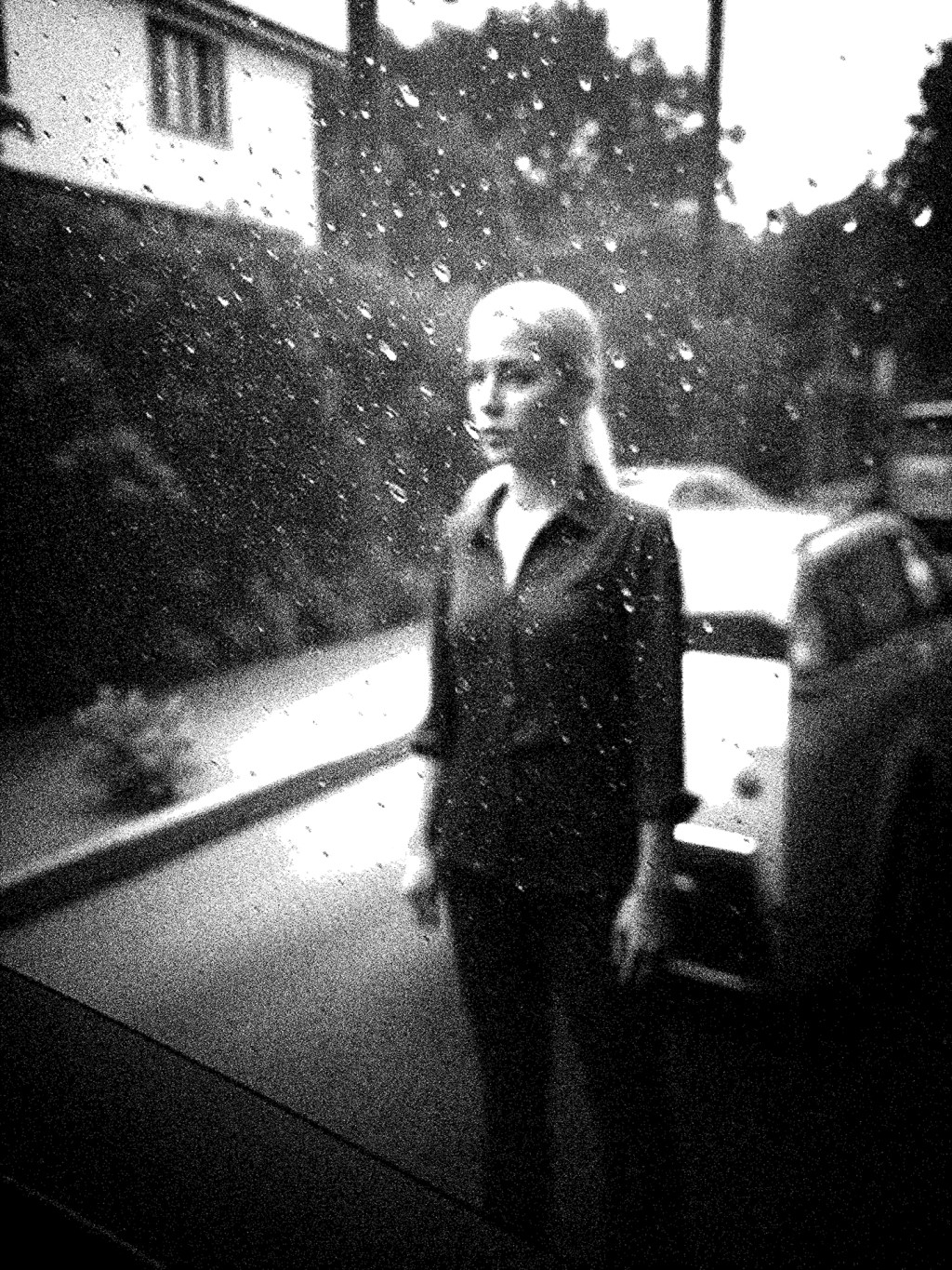 She stands just beyond the glass, caught in a pause between storm and silence. The rain can’t touch her resolve—she’s luminous, even in the blur.