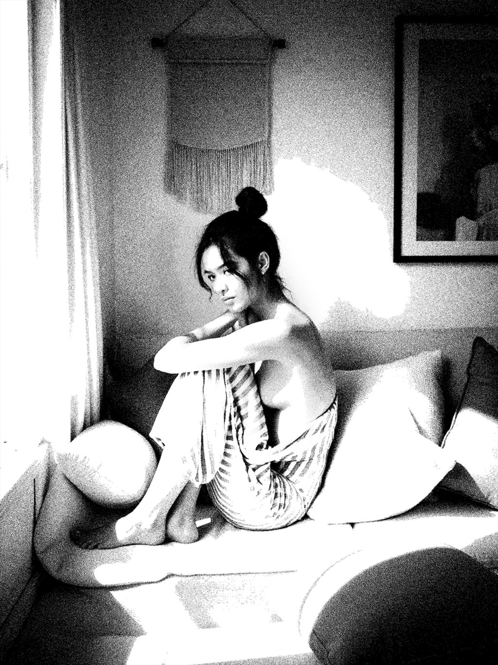 Morning light pins her to the cushions like a whispered memory. Stillness wraps her like linen, soft and unresolved.