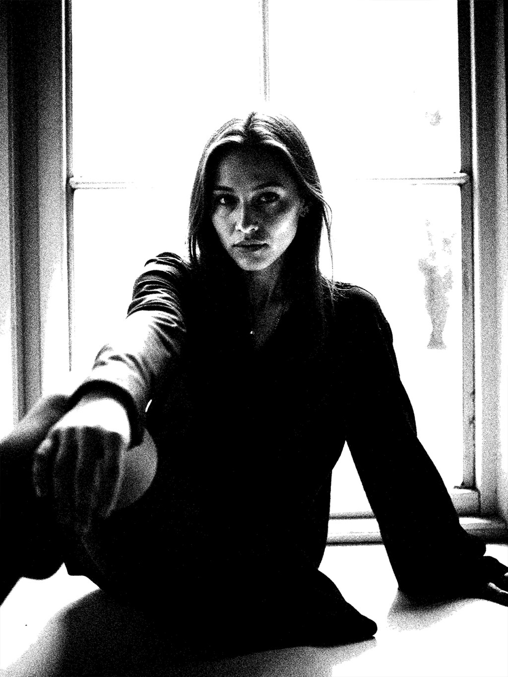 Dressed in black, gaze locked and steady, she turns the window into a stage and dares the world to blink first.