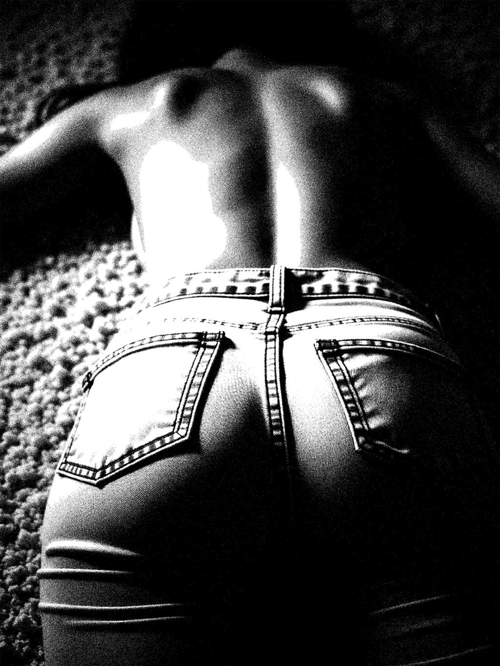 Her body stretches across the floor, spine kissed by light, denim hugging every curve like second skin. Strength lives here—in the arch, in the still heat between breath and motion.