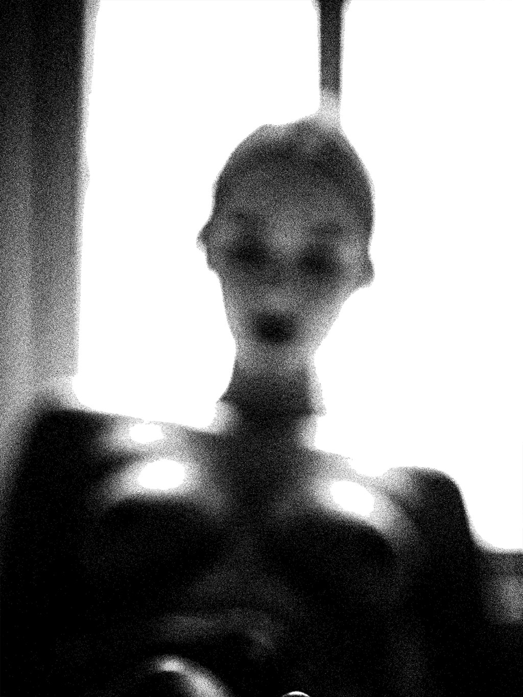 She rises from a blur like a memory half-formed, eyes lost to light, mouth heavy with silence. She is both presence and phantom—unreal, but undeniable.