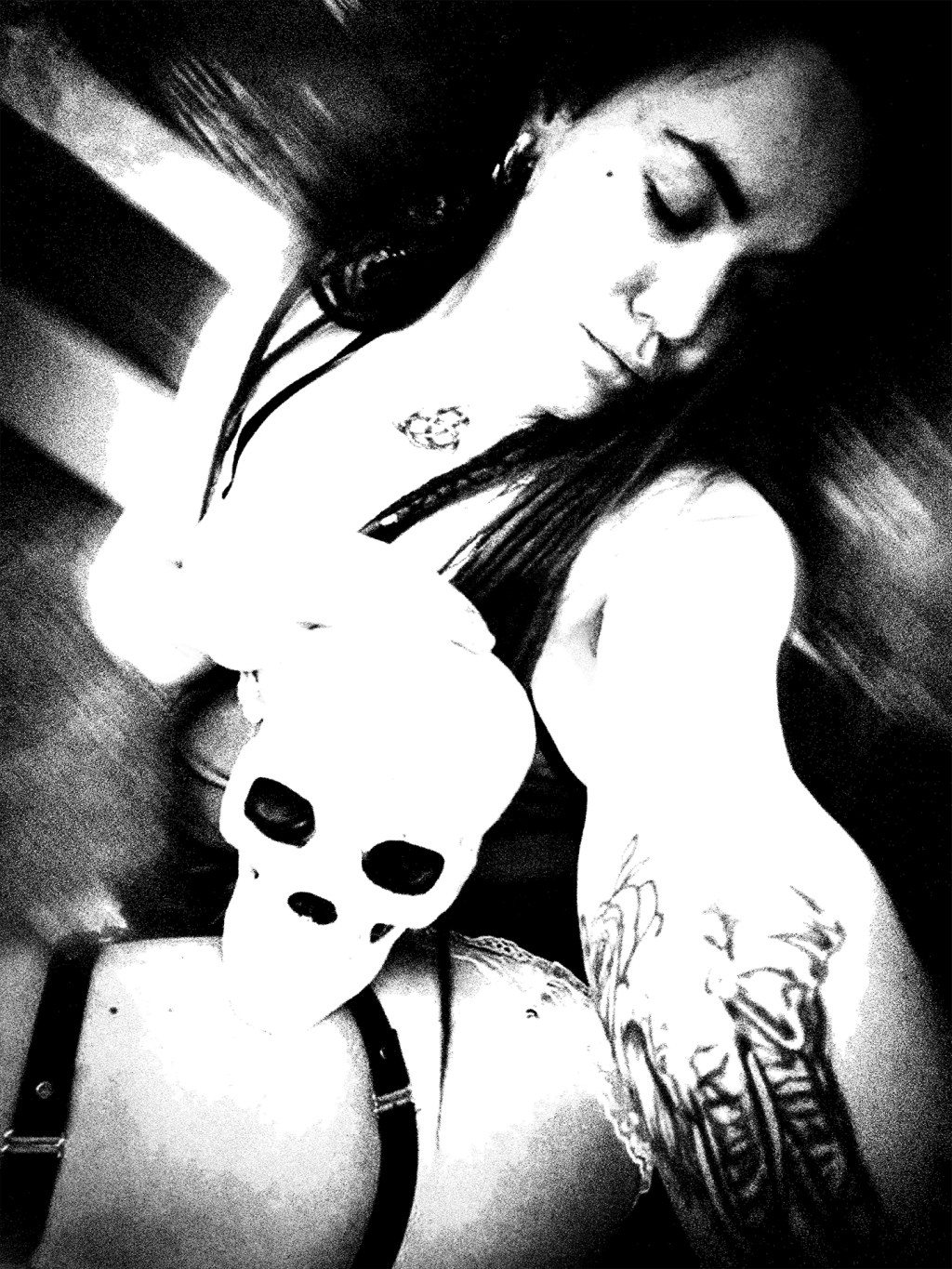 She holds the skull like a confession, cradling mortality with calm defiance. Eyes closed, lips still, the moment teeters between seduction and surrender.