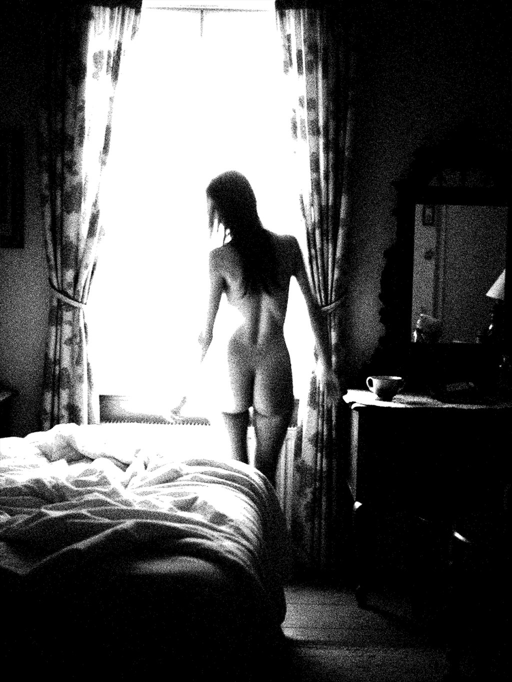 She stands in the hush of morning, framed by soft curtains and the silence of her own thoughts. The light kisses her spine, tracing every curve like a whispered devotion. There’s no rush—just a woman in the quiet power of being.