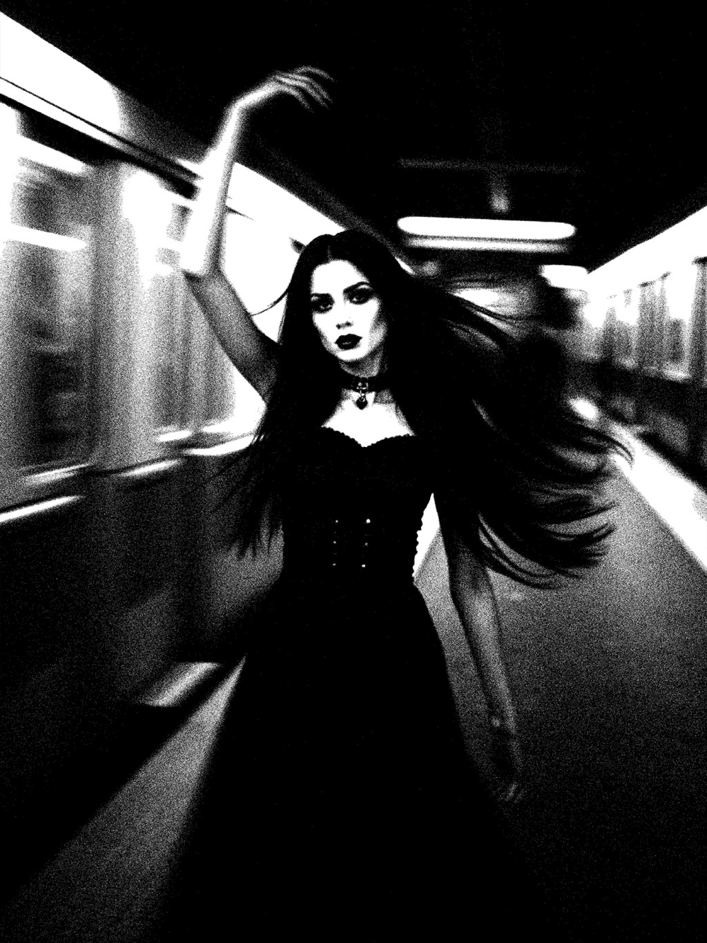 She moves like a spell in motion, casting shadows through fluorescent flicker and blur. Her arm lifts not to wave, but to summon—an invitation to witness her power, her beauty, her untamed will. In a place built for rushing, she makes time halt.