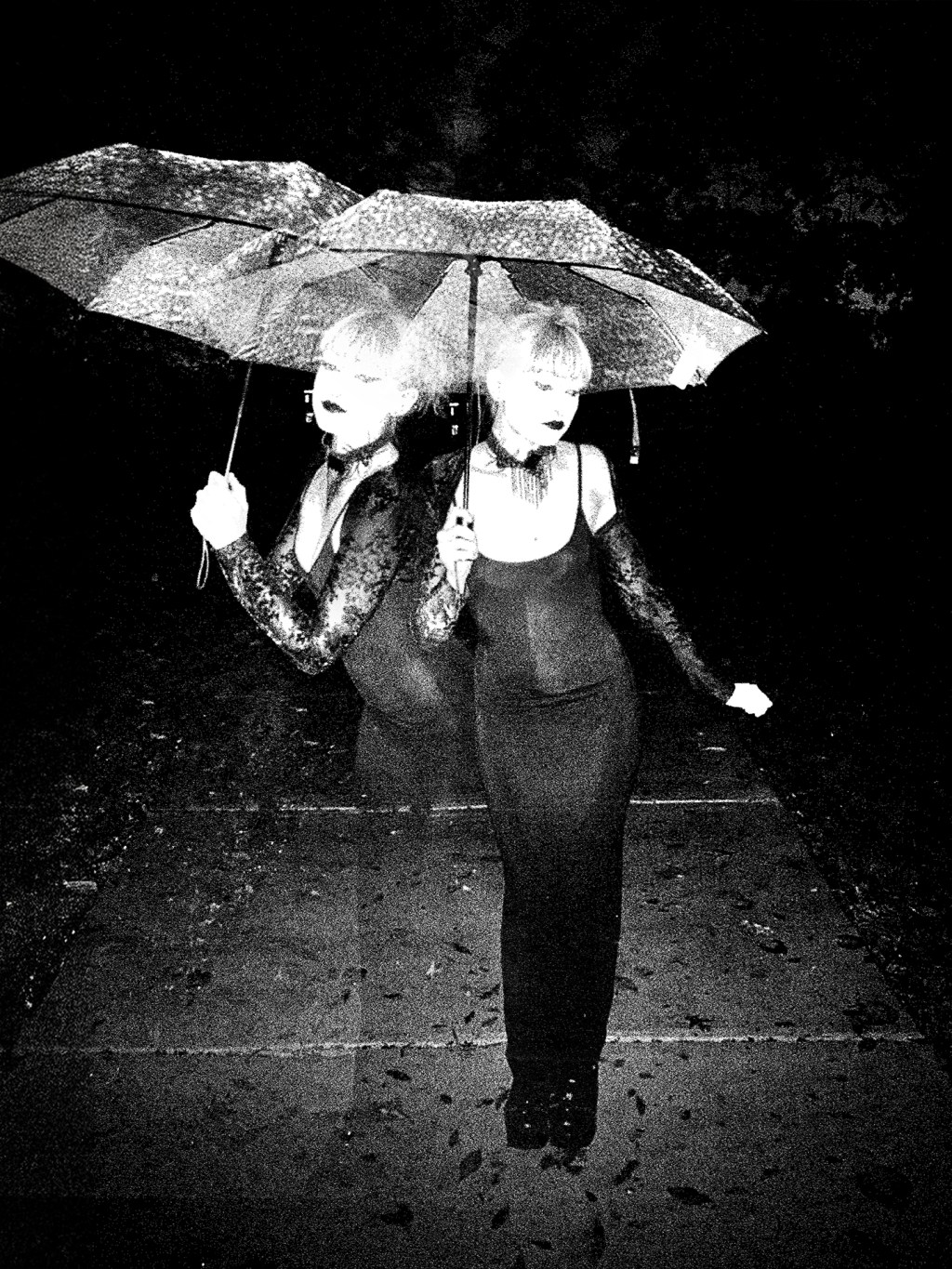She stands in both worlds at once—real and imagined—framed by umbrellas and a silence only the dark can hold. Her beauty is doubled, not divided.