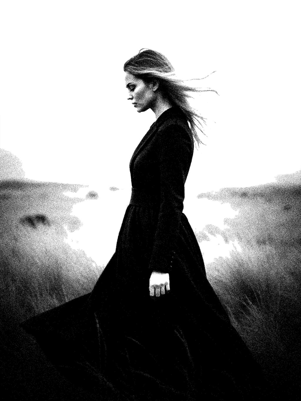 She walks with the hush of memory, the land bending gently to her silence. Hair pulled by ghosts, dress sweeping stories no one dares to say aloud.