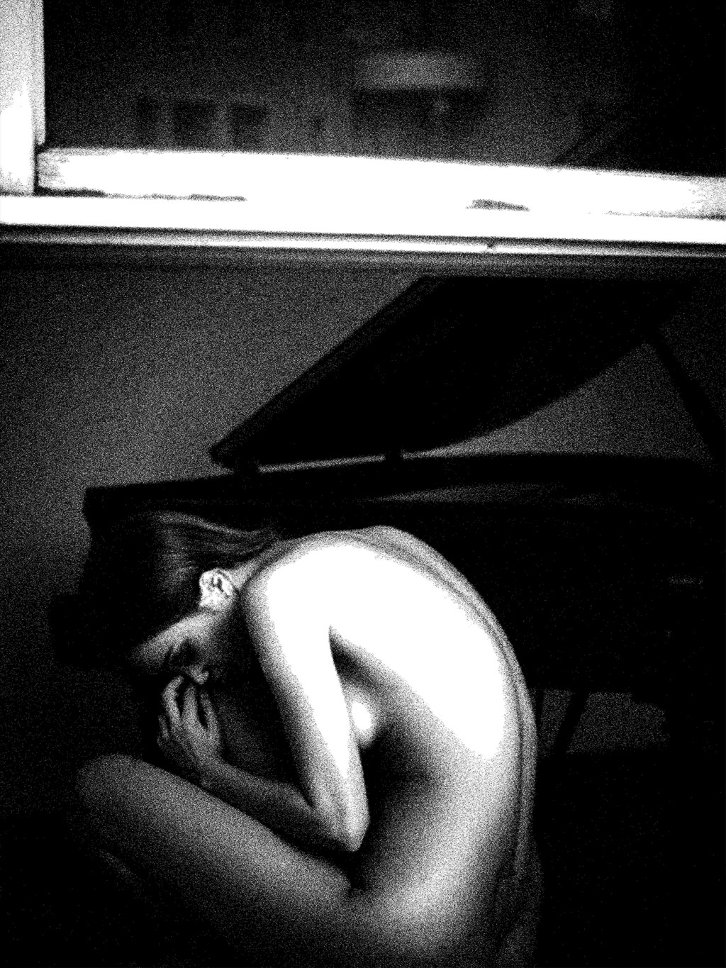 Curled in the hush of the room, she becomes a quiet hymn—fragile yet whole, trembling with grace. The soft bend of her spine holds the ache of a thousand piano notes never played.
