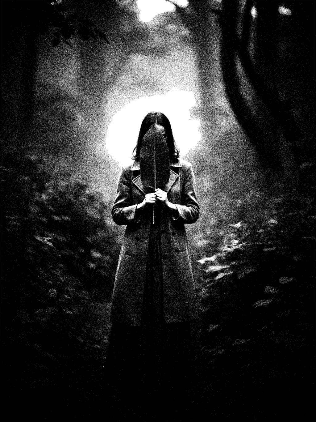 The world has always asked for her face, but she offers only presence. Rooted, resolute, and wrapped in shadows, she tells her story in stillness, leaving you to wonder what truths lie just behind the green.