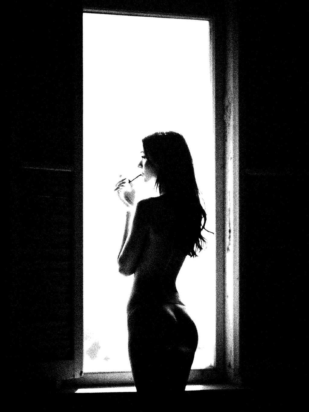 She stands wrapped in morning hush, the window her only witness. With a flick of fire and breath of smoke, she claims her quiet rebellion—soft lips, strong stance, untouchable grace.