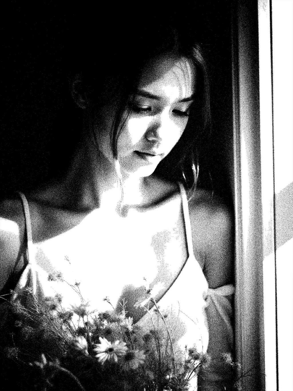She leans into the window light, where soft petals echo the gentleness in her gaze. There’s something timeless in the way she carries stillness, like a poem unspoken but deeply felt.