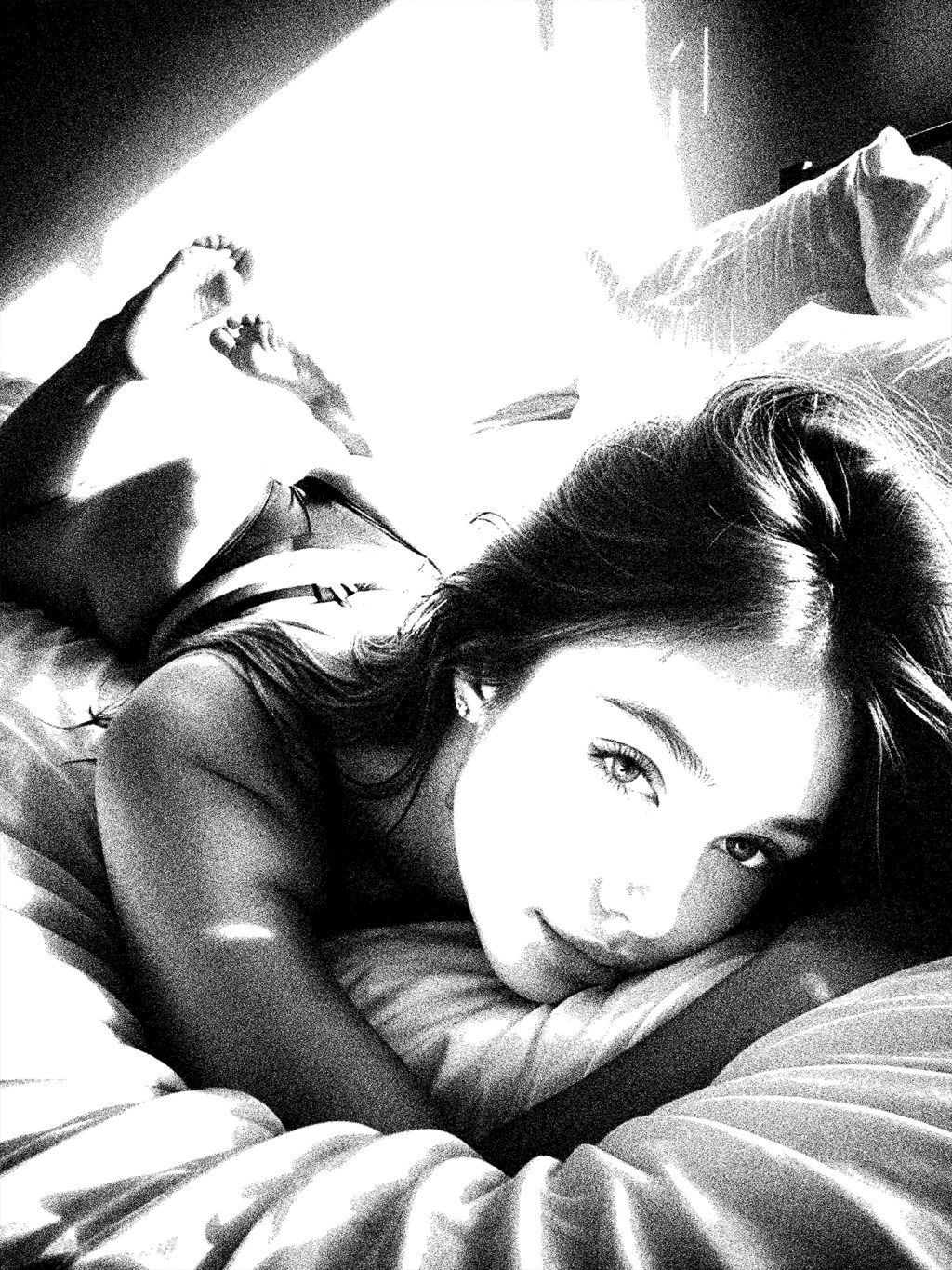 She rests in the hush of morning, where warmth clings to the linen and sunlight spills like a secret across her gaze. There’s a softness in the stillness, a kind of peace that asks for nothing but breath.