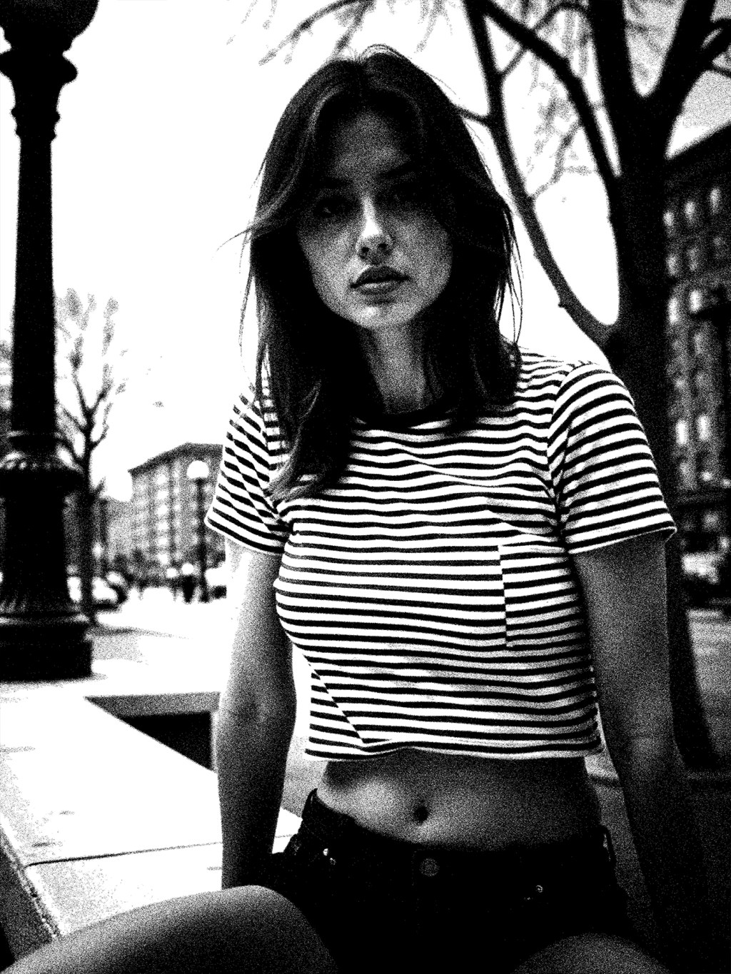 Amid the frozen rhythm of the street, she waits—unhurried, unreadable. The wind carries yesterday’s warmth, brushing past her like a memory she won’t chase.