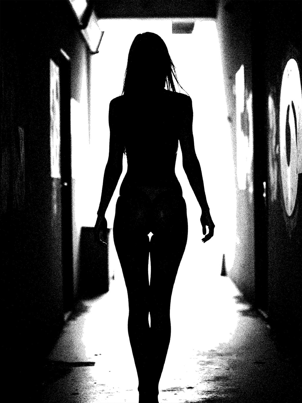 She walks like a shadow born of flame—confident, unspoken, impossible to ignore. The world behind her is dim and empty, but she brings her own gravity into the room, a silhouette of beauty that doesn’t ask for attention—it demands it.