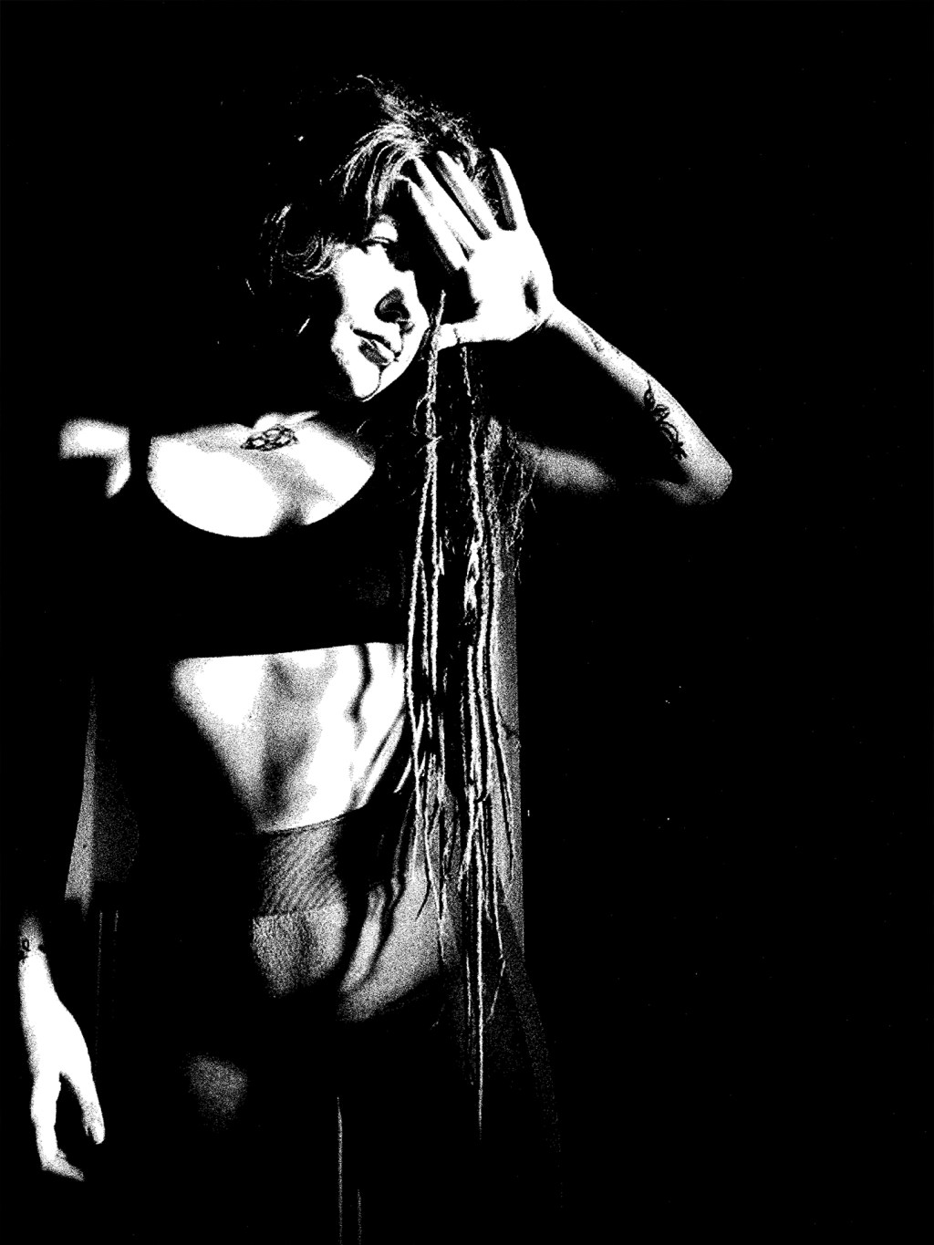 She stands where darkness meets a burning glow, shielding her gaze yet drawn to its heat. Shadows cling to her curves, while strands fall like whispers, carrying the weight of untold thoughts into the void.