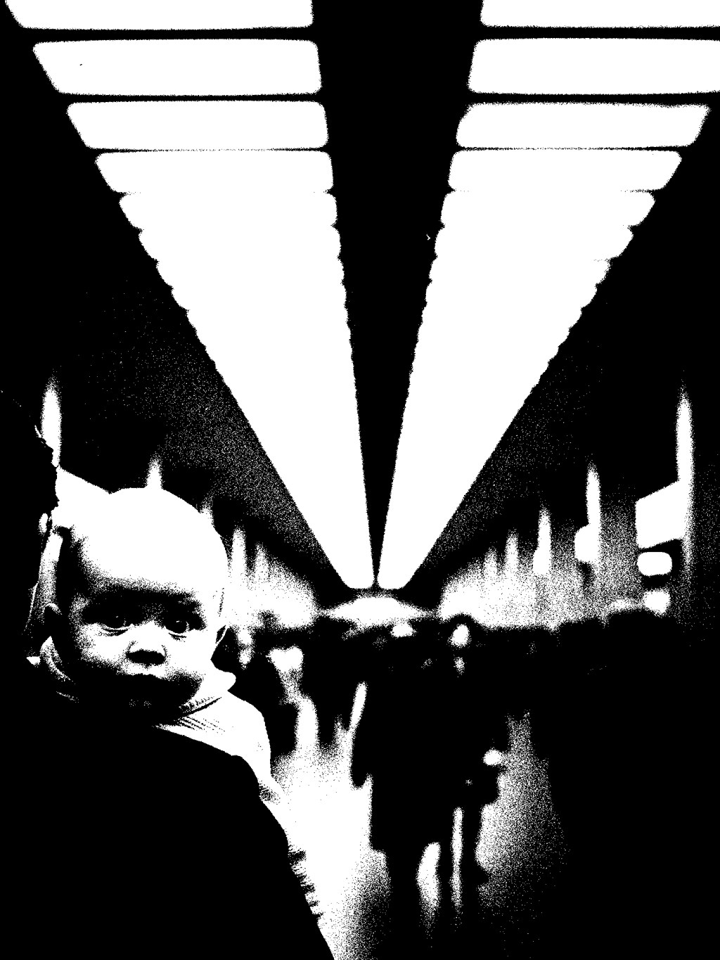 In the rush of a thousand shadows, a small face turns toward the light—wide-eyed, unblinking, as if trying to memorize the shape of the world.