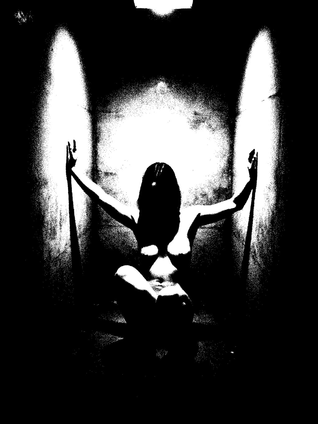Light carves a shrine around her, but she remains untouchable—rooted, radiant, and unbound. Arms stretched wide, she holds the dark like a lover, commanding stillness in her quiet rebellion.