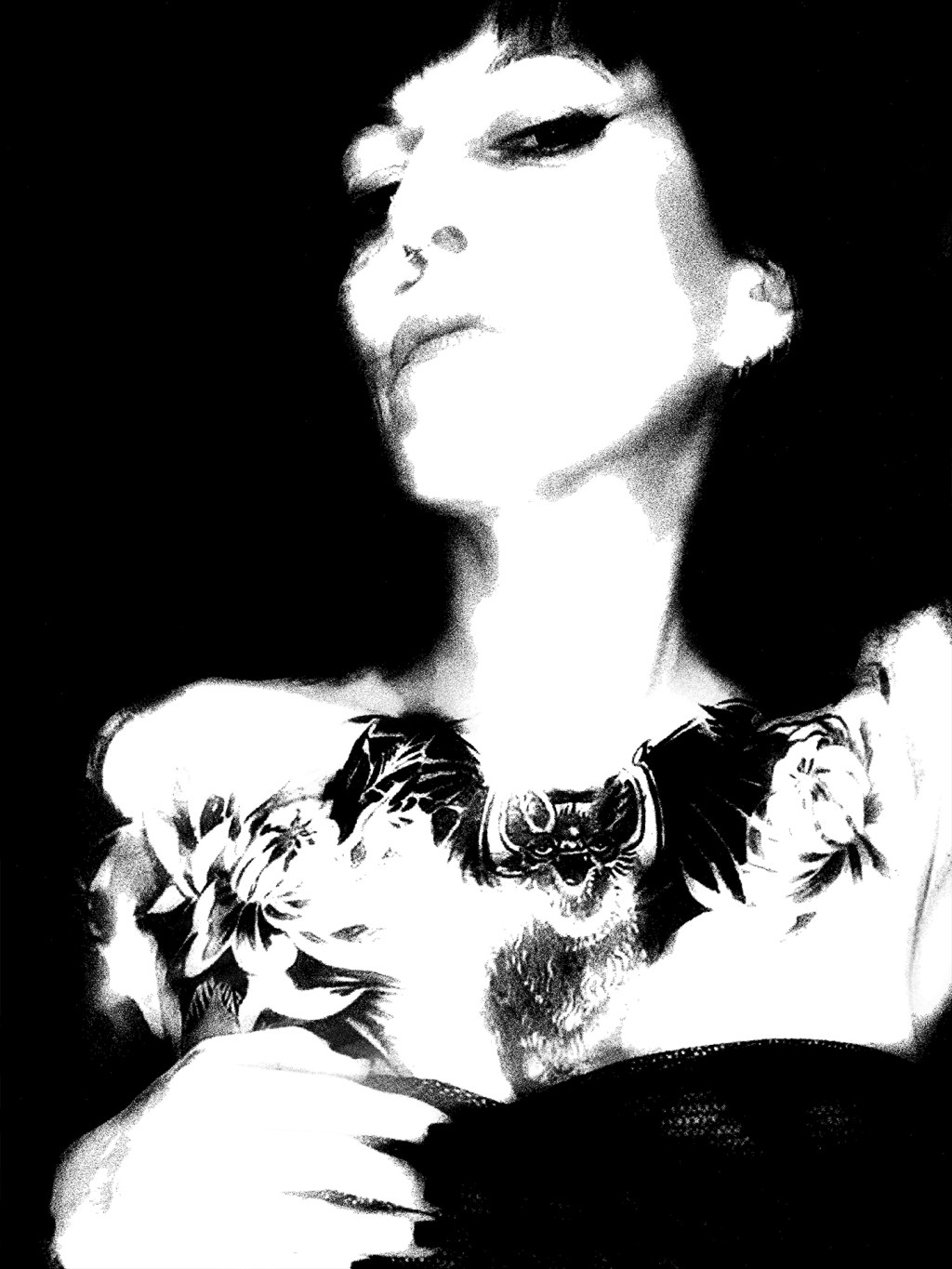 She wears her defiance like a crown, carved in ink and bone. Eyes lifted in quiet command, she invites neither pity nor permission. The bat spreads its wings across her chest, a guardian of the night, a whisper of danger wrapped in beauty.
