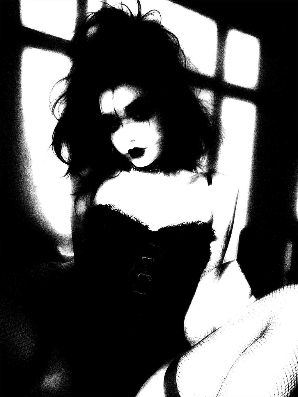 Framed in light and darkness, she sits in quiet rebellion. Her hair falls like ink over porcelain skin, lips painted with the weight of unspoken truths. In her stillness, there is fire—soft, smoldering, and impossible to ignore.