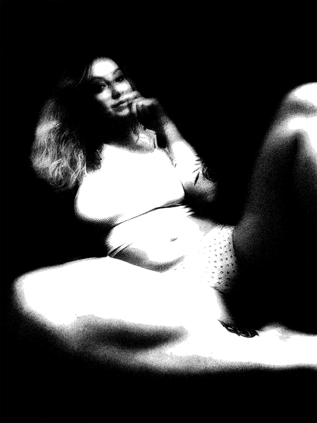 She reclines in the quiet, a half-smile playing at the edge of her thoughts. Between the curves of light and shadow, her beauty rests unguarded—unhurried, untamed, entirely her own.