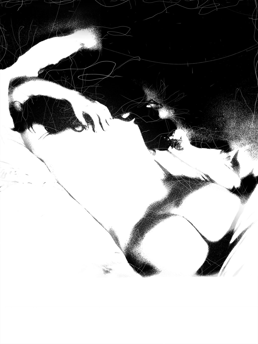 Her body drifts between shadows, tangled in threads of unseen energy. Light maps her curves, tracing fragility and strength in the same breath. It is both surrender and defiance, a moment stretched between desire and dream.
