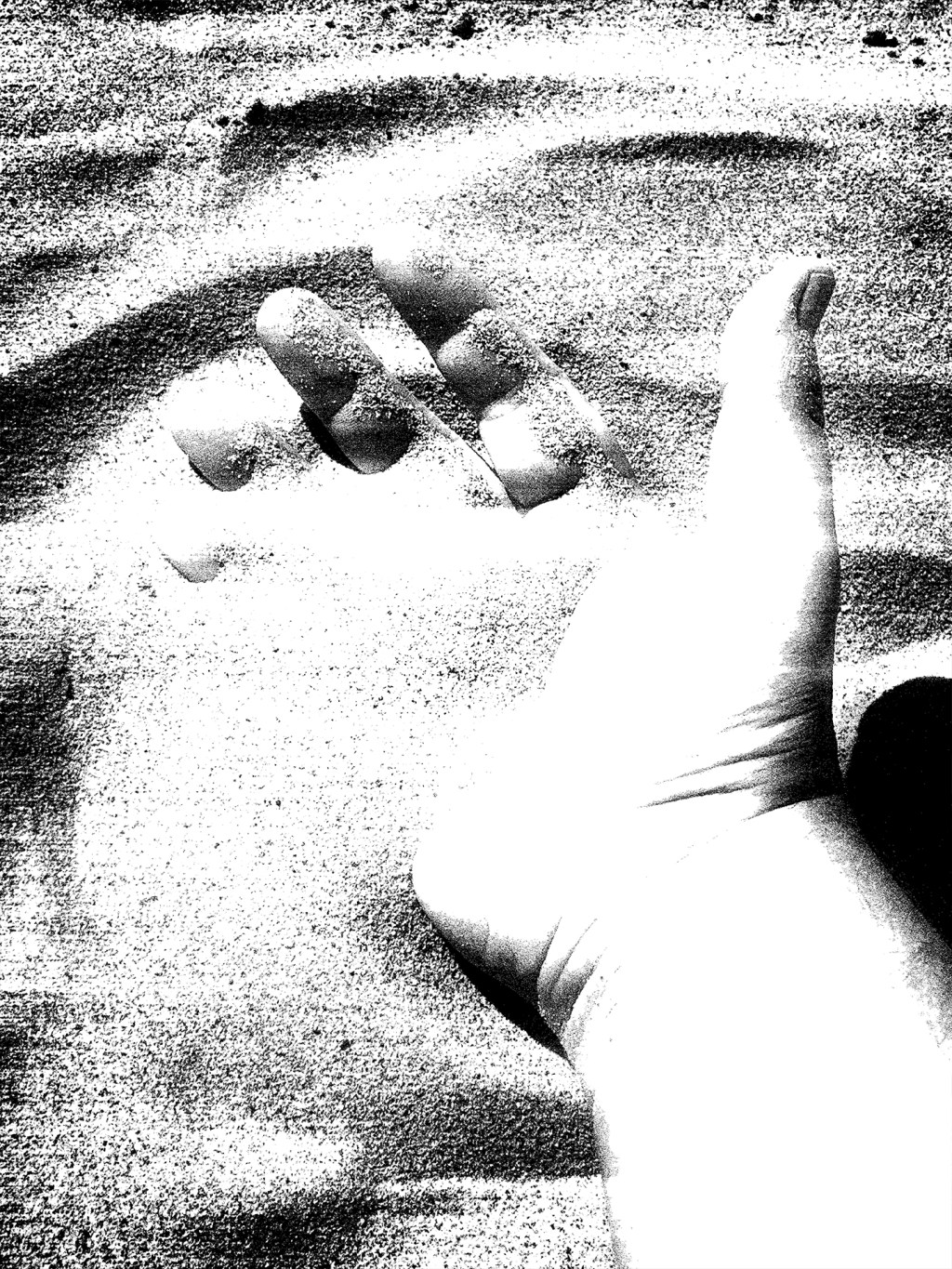 Hand rises from the sand, caught between grasping and letting go. Each grain clings to the skin like fragments of memory, impossible to hold forever, destined to slip away. The harsh contrast transforms the scene into something elemental: the tension between presence and erosion, permanence and impermanence.