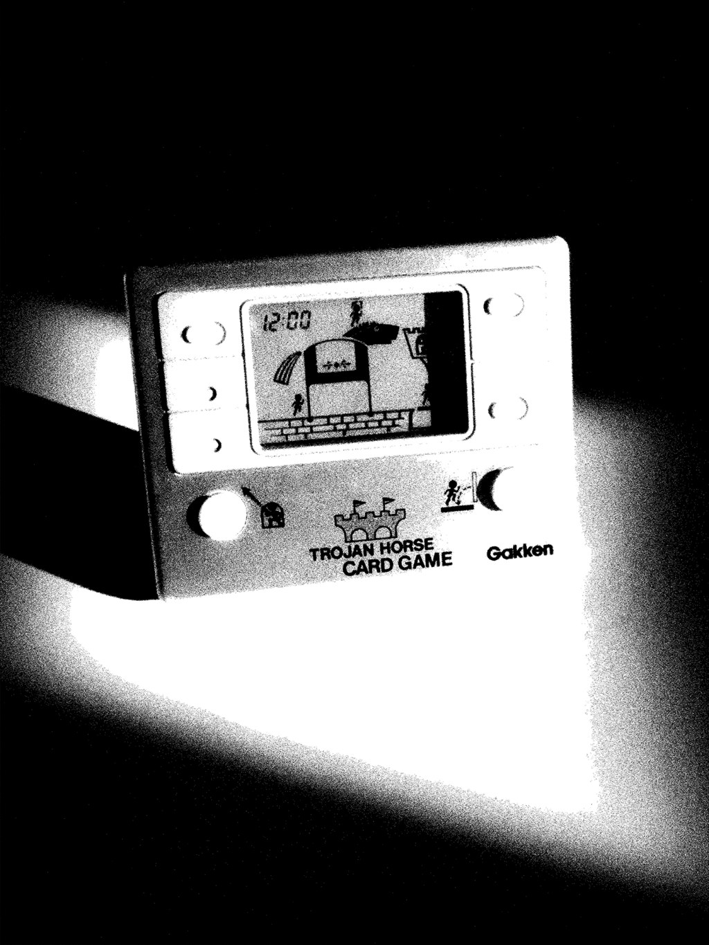 An artifact from another era glows in the spotlight—a Gakken Trojan Horse Card Game. Its tiny LCD screen freezes a moment of digital mythology: a warrior, a castle, and the looming Trojan horse itself.