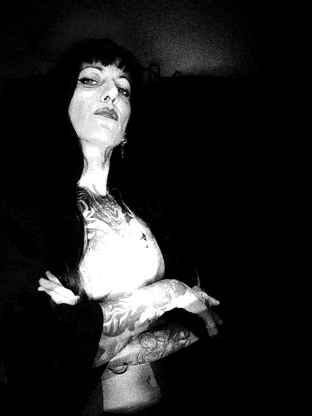 Arms folded, gaze unflinching, the presence radiates defiance. Tattoos blaze like armor beneath the skin, each mark a story carried into the dark.