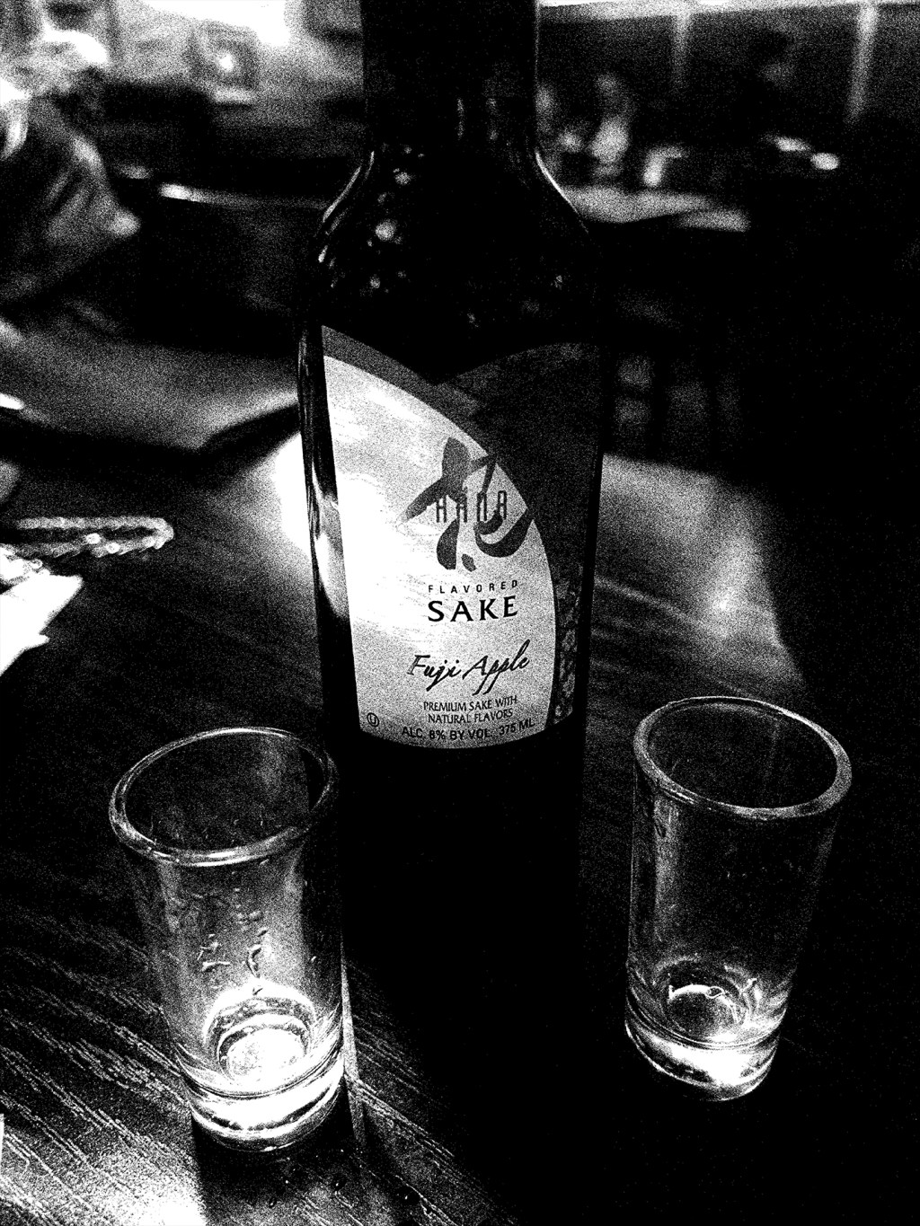 A bottle of Fuji apple sake, two glasses waiting—intimacy hinted at in the quiet glow of a bar. The stillness before a toast, before laughter, before the night unfolds.