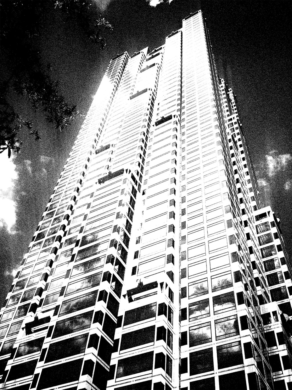 The tower stretches skyward, glass and steel climbing endlessly into the dark. Reflections ripple across its face like fragments of sky captured and held still.